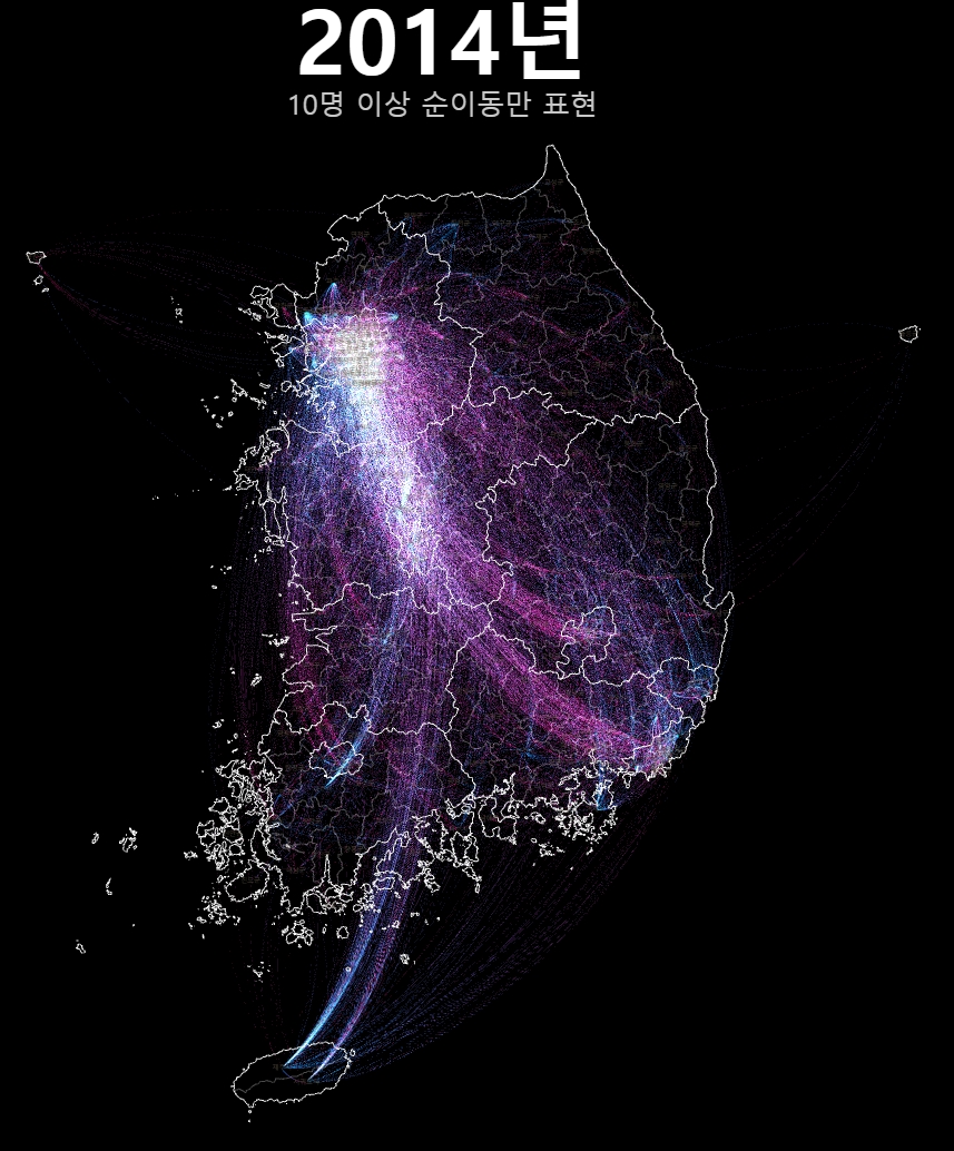 여기까지 20년간 시군구간 순이동 시각화를 매개로 OD시각화에서의 고민과 인구 이동이라는 특수한 대상에서의 표현의 문제를 다뤄보았다. 인구 이동 양상은 지금 우리 사회에서 매우 중요한 문제다. 누군가는 이 글을 읽고 이 데이터에 좀 더 친숙하게 다가갔으면 했다. 기약은 없지만, 이 시각화는 시간날때마다 조금씩 업데이트 해 볼 생각이다.