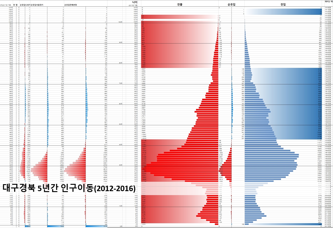 경북 지역 시군구는 이곳 저곳에서 40세 이상이 유입되고, 대구 지역에서 수도권이나 천안, 부산 울산 등으로 40세보다 젊은 사람들이 이동했다는 사실이 확실하게 보인다. 위의 엑셀 조건부 서식에서 사용한 색상과는 의미가 약간 다르지만, 엑셀에서 만들어본 결과가 그대로 지도 위에 나타났다.