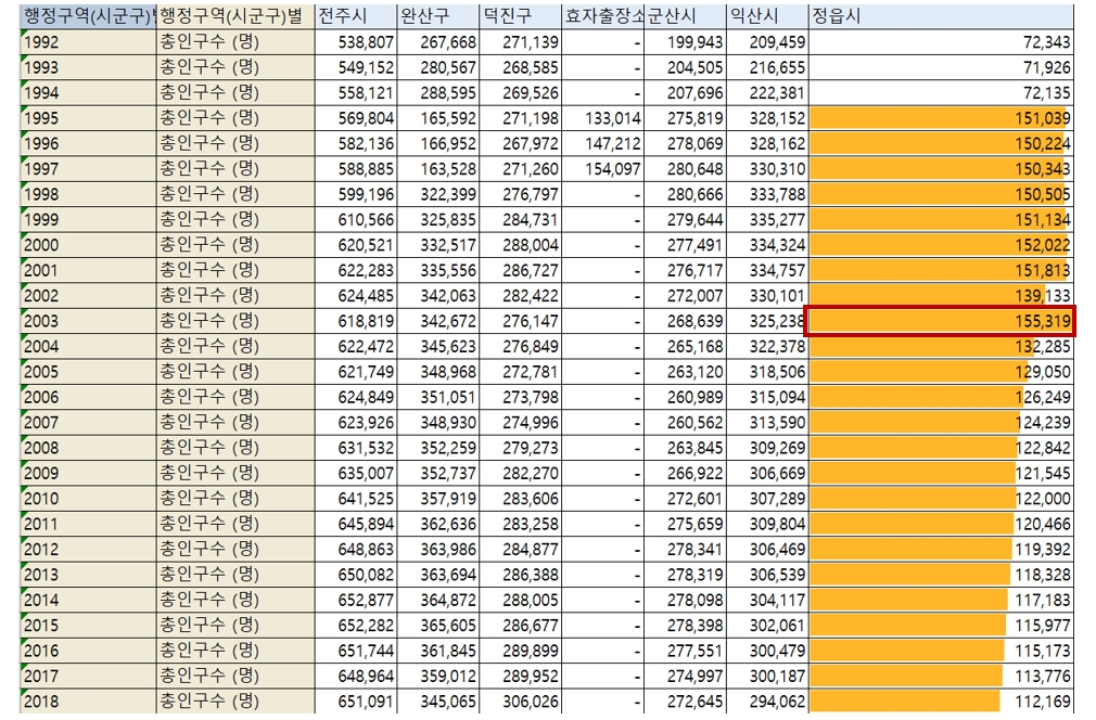 그러다가 징계를 받거나 경고를 받은 것 같다. 2004년부터는 그런 일을 하지 않은 것 같다. 어쨌든 이러한 인구 유지에 대한 노력은 통계청 공식 통계에도 흔적으로 남아 있다. 정확히 말하자면, 이 전입전출 데이터 자체가 공식 통계에 사용되는 자료이고, 정읍시 주민등록 인구를 보면 아래와 같은 기이한 봉우리가 보인다.