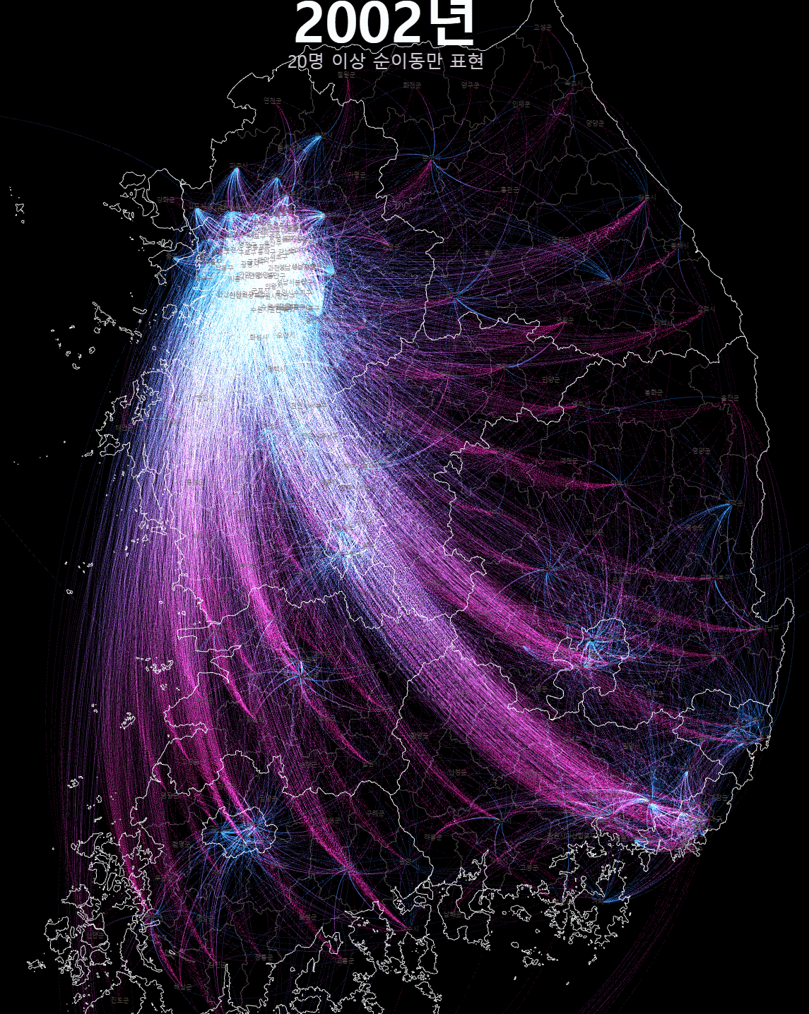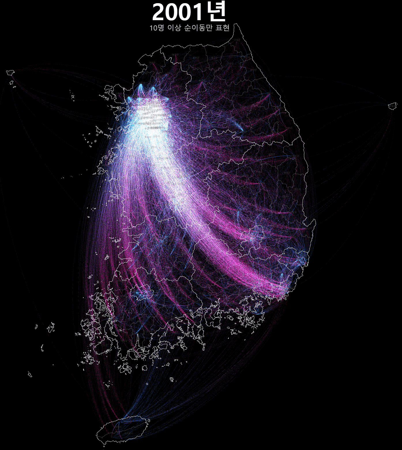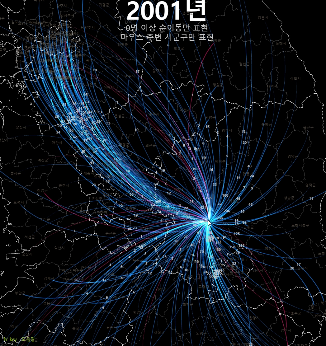 이번에는 대략 10명 이상의 순이동만 보도록 위아래 화살표 키보드를 눌러서 조정하고 z키와 x키로 2001년과 2020년을 번갈아 바꿔보자. 20년 사이에 전국적인 이동의 경향이 어떻게 변했는지 비교해 볼 수 있다.