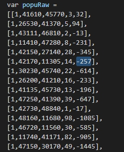 읽어들이는 파일을 netpopumove.js 에서 netpopumove-alt.js로 바꿔주면 된다. 모두 메모장에서 열리므로 내용을 직접 확인해볼 수 있다. 위의 파일이 모두 같은 폴더에 있다면, 수정 후에 index.html을 크롬 등에서 실행시키면 별도의 인터넷 연결 없이도 로컬에서 돌려볼 수 있다.