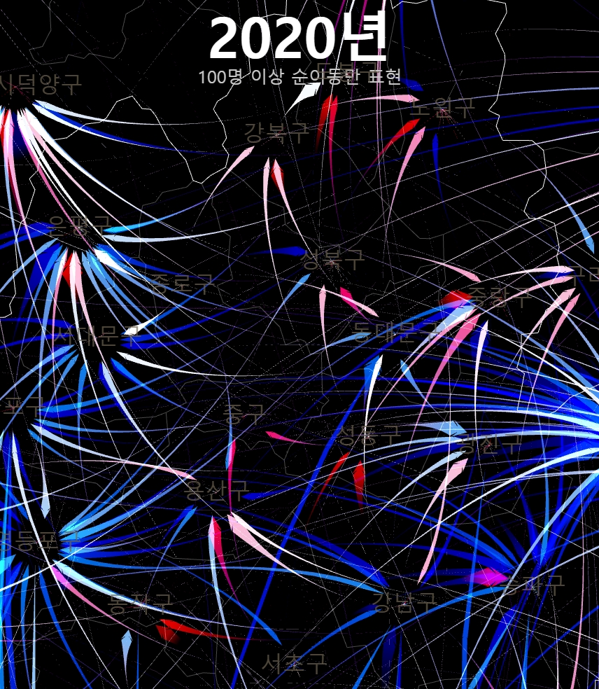 여기까지 20년간 시군구간 순이동 시각화를 매개로 OD시각화에서의 고민과 인구 이동이라는 특수한 대상에서의 표현의 문제를 다뤄보았다. 인구 이동 양상은 지금 우리 사회에서 매우 중요한 문제다. 누군가는 이 글을 읽고 이 데이터에 좀 더 친숙하게 다가갔으면 했다. 기약은 없지만, 이 시각화는 시간날때마다 조금씩 업데이트 해 볼 생각이다.