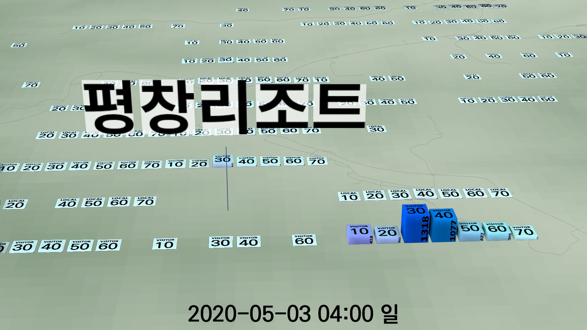 이제 마지막으로 한 가지를 더 붙여보자. 전국을 250개 시군구로 구분한 후, 예를 들어 송파구에 집이나 직장이 있으면 그 사람은 송파구에 정기적으로 나타난다. 밤에 잠을 자거나. 이 사람을 '현지인'으로 정의해보자. 그리고 그렇지 않은 사람들을 외지인으로 정의하자. 물론 집이나 직장 역시 알고 있지 못하므로 정확하지는 않을테지만, 낮 시간에 얼마나 많이 머무르는지, 밤 시간에 얼마나 많이 머무르는지 집계해보면 꽤 높은 확률로 집과 직장(혹은 학교)를 추정해볼 수 있다.