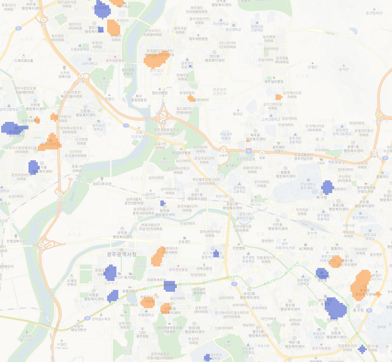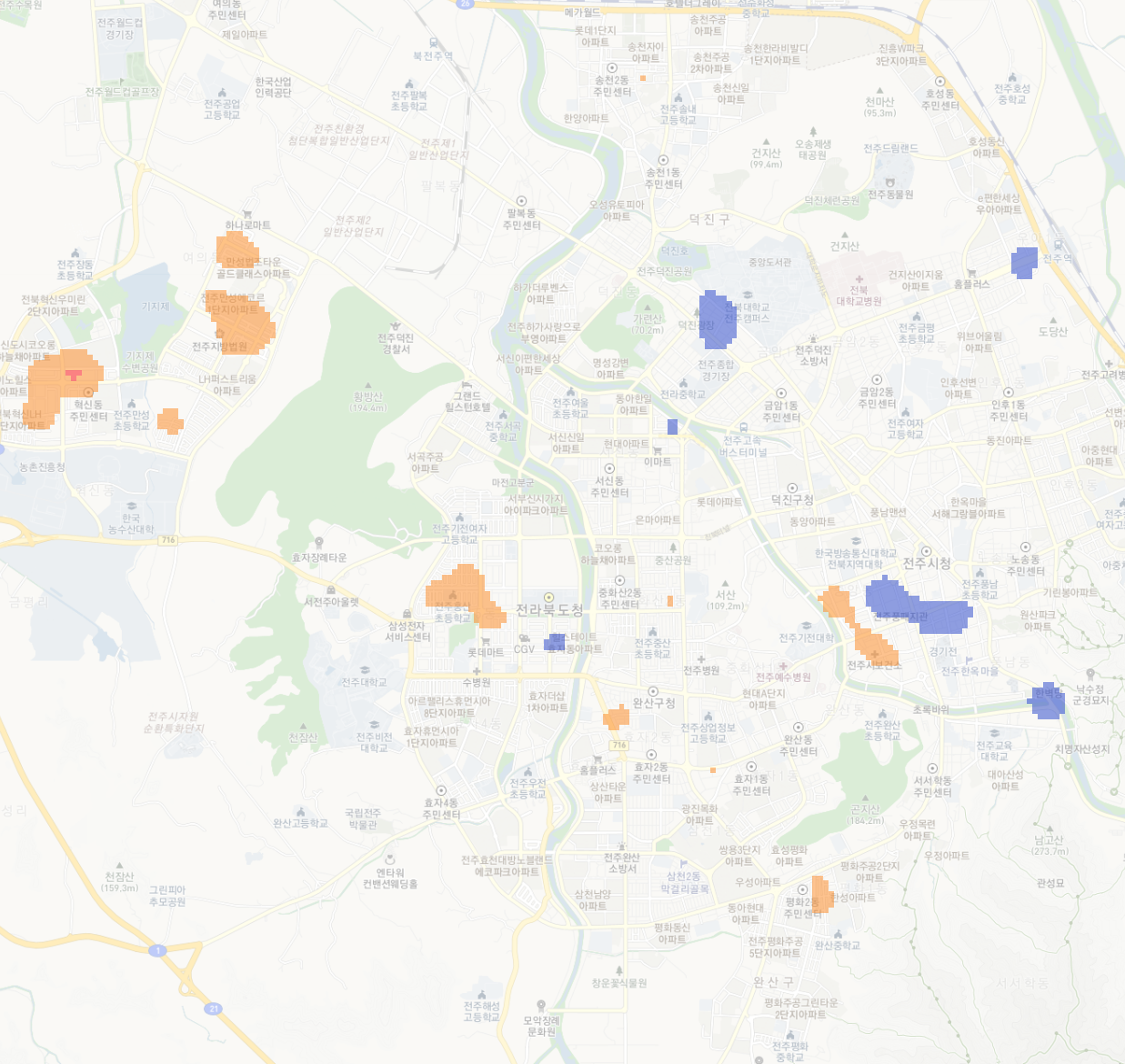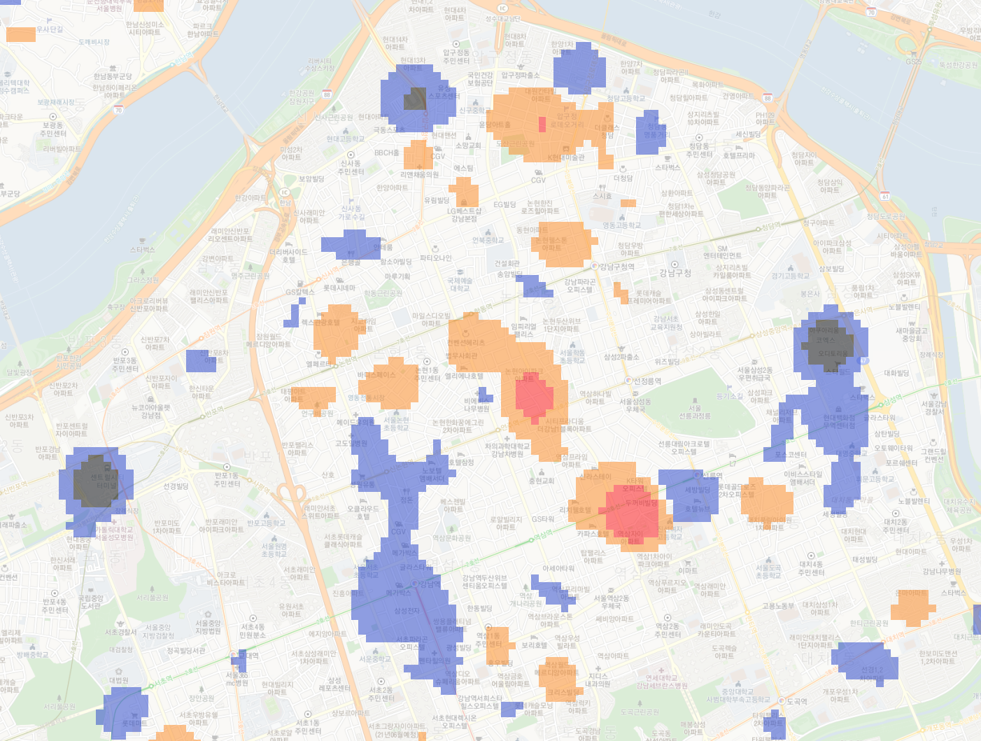 이제 지도도 약간 흐리게 보이고, 그래서 히트맵도 좀 더 알아보기 쉽게 되었다.