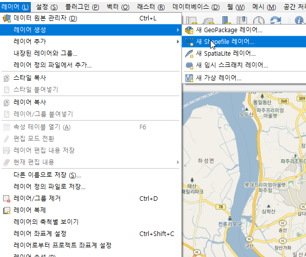 새 shape 파일 레이어로 폴리곤 레이어를 만들어 준 후 전국을 덮는 도형을 하나 추가한 후에 반투명한 흰색을 부여하면 된다.