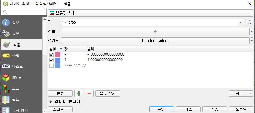 심볼은 [분류값 사용]을 선택하고 크기를 [지도단위] 50m 로 설정해보자. 지도 확대 축소에 관계 없이 동일한 크기로 보여준다. 사실 히트맵과는 크게 상관없는 부분이라, 이미 이런 설정에 익숙하다면 자신이 원하는대로 해주면 된다.