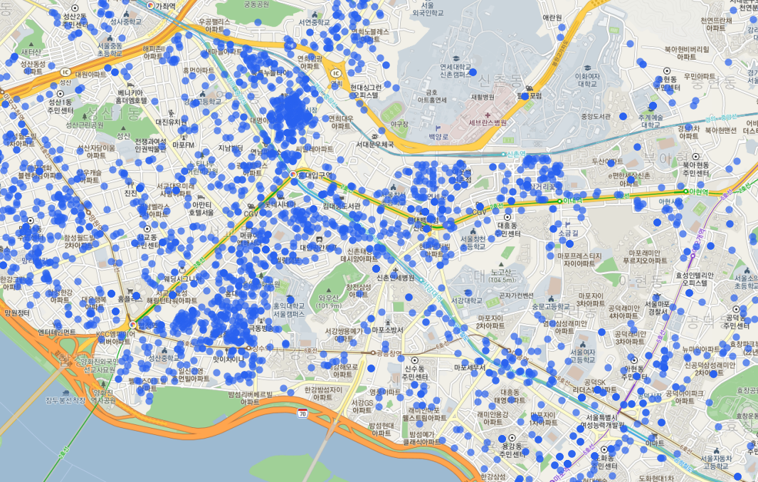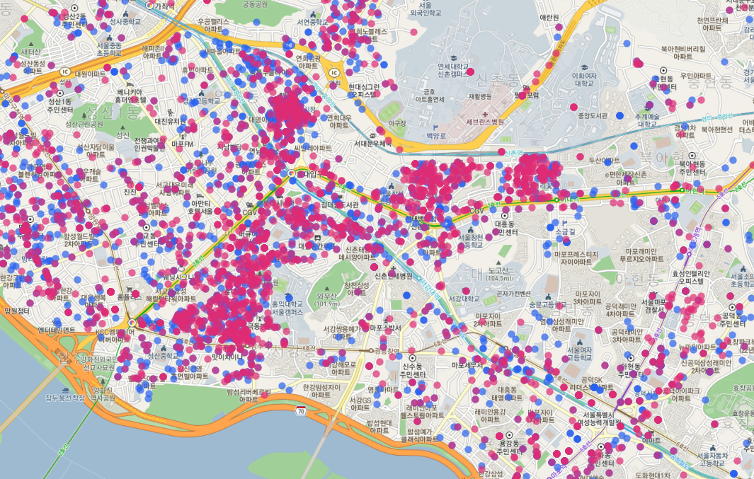 안타깝게도 카카오 지도의 투명도를 조절하는 부분은 없는 듯하니, 히트맵과 지도 사이에 반투명한 도형을 하나 그려주자.
