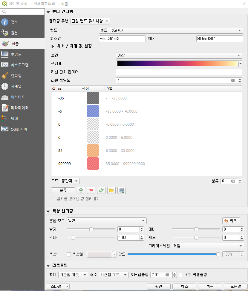 [렌더링 유형]은 단일 밴드 유사색상으로 두고