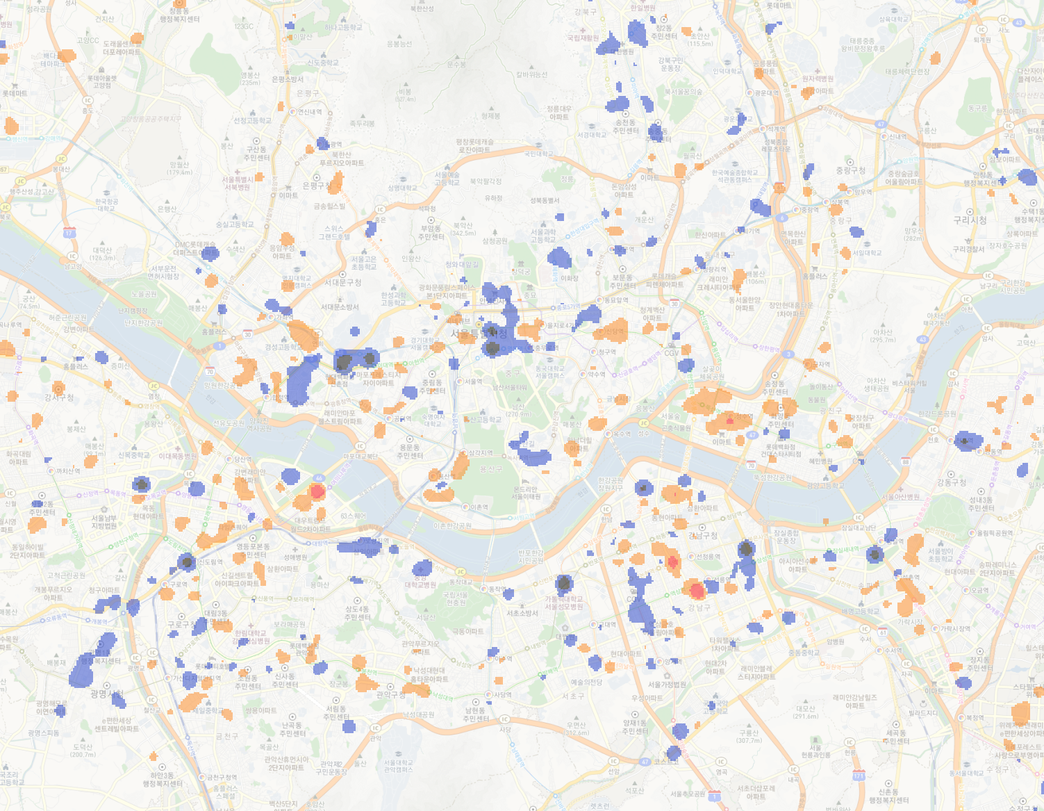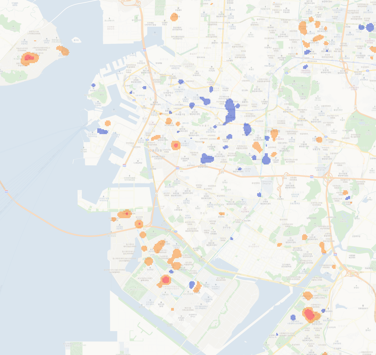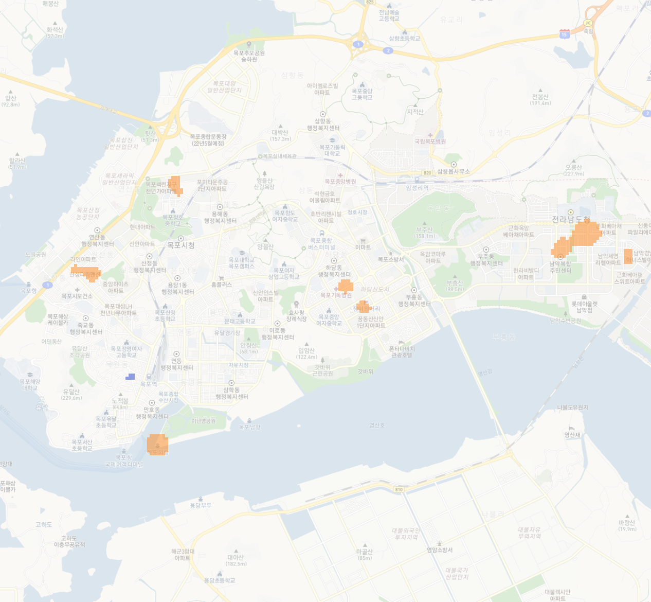 이제 지도도 약간 흐리게 보이고, 그래서 히트맵도 좀 더 알아보기 쉽게 되었다.