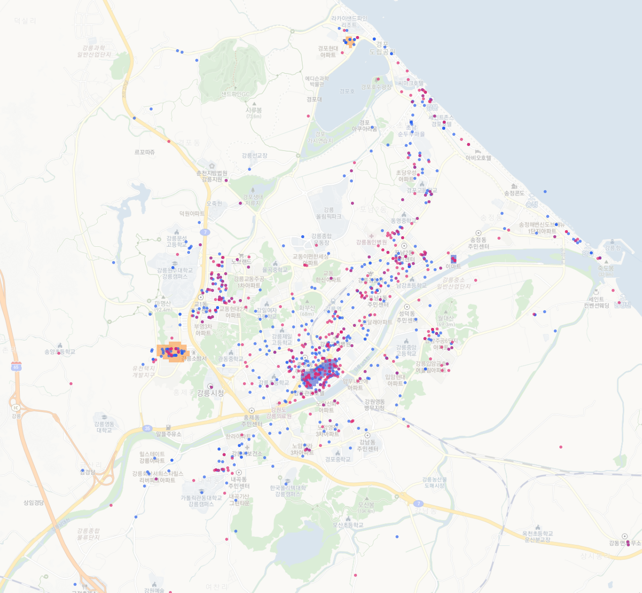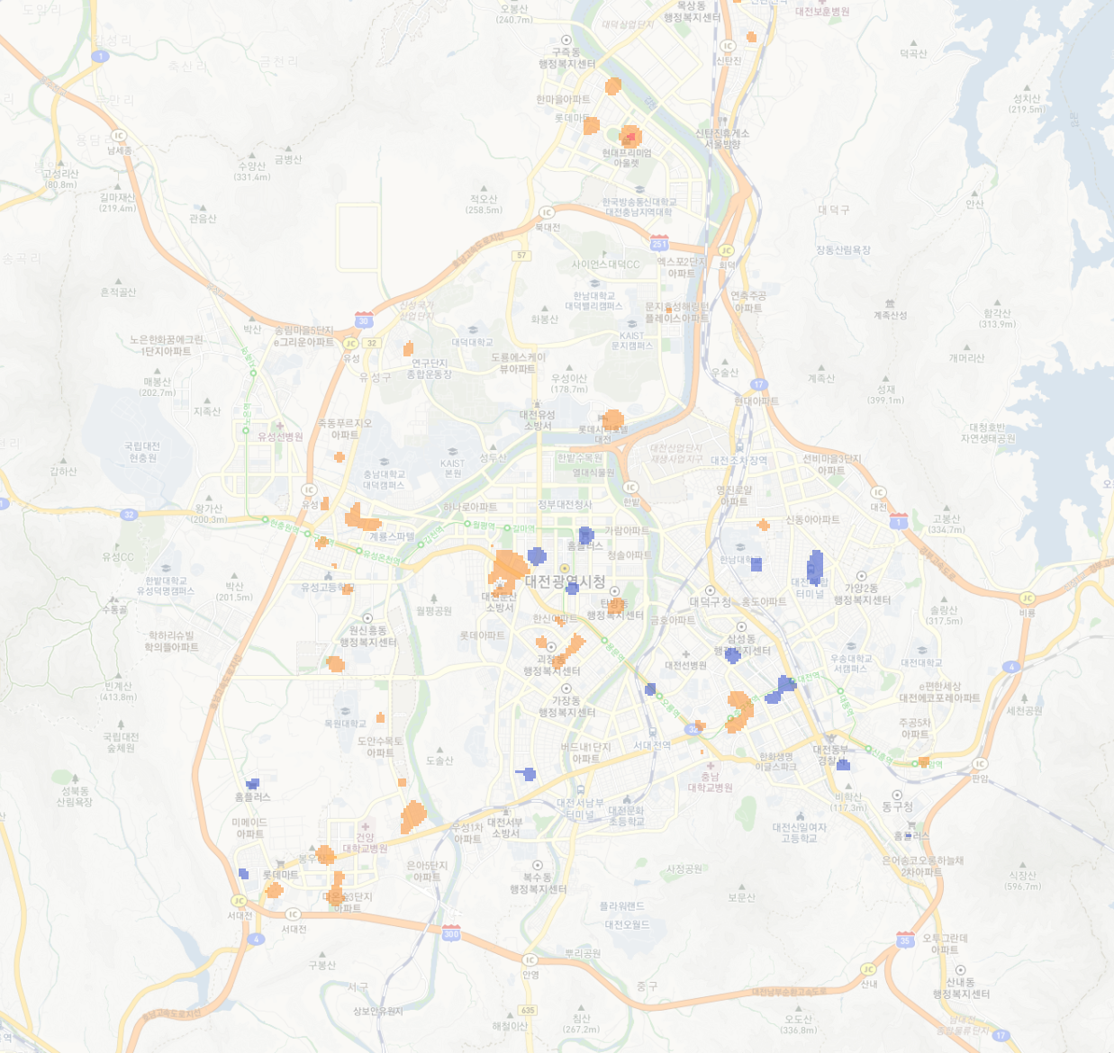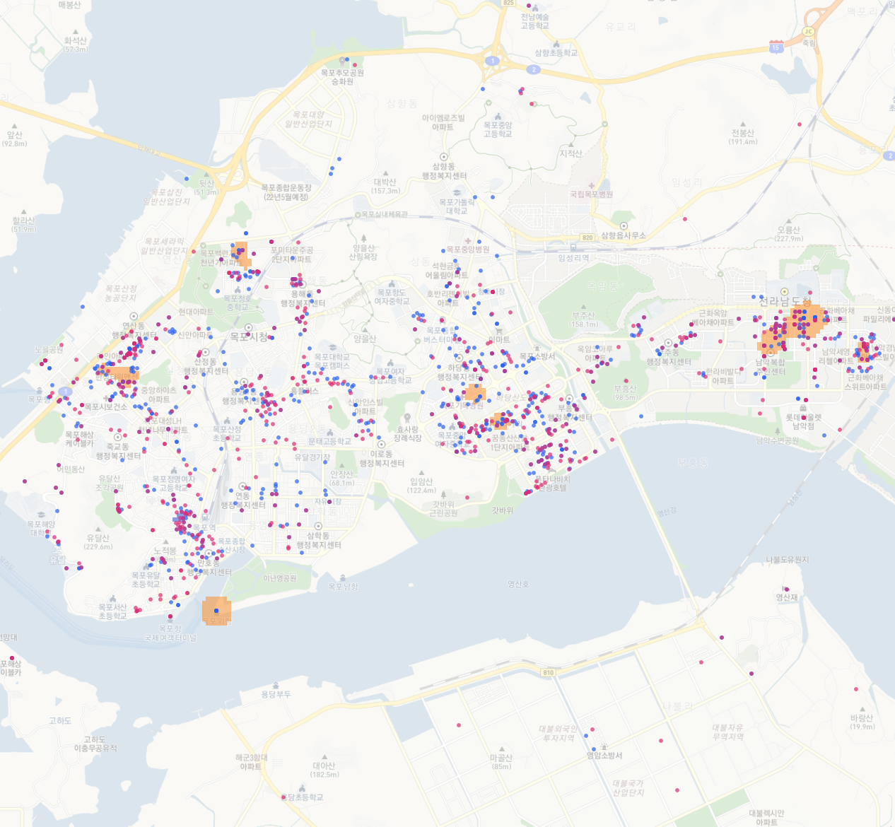 이제 지도도 약간 흐리게 보이고, 그래서 히트맵도 좀 더 알아보기 쉽게 되었다.