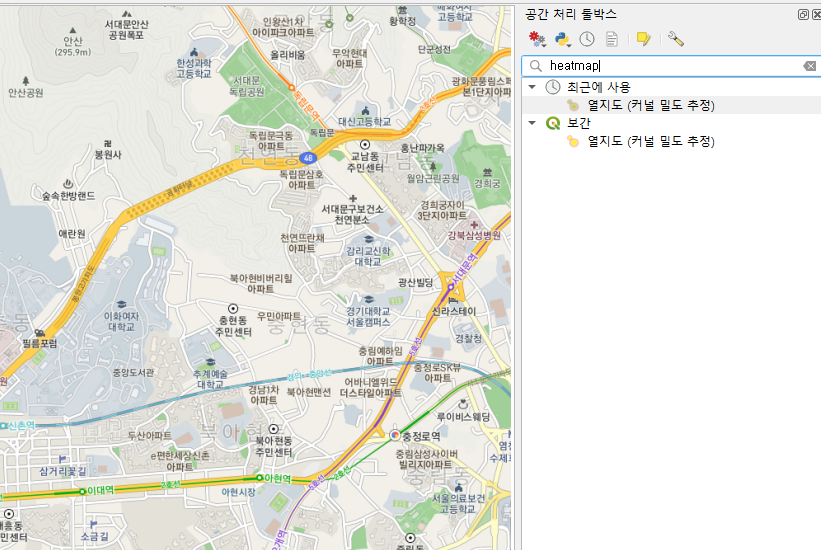 화면 우측의 공간처리 툴박스에서 heatmap으로 검색해보면 플러그인 딱 하나가 보인다.