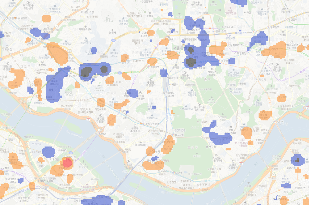 히트맵 알고리즘은 화선지에 묽은 먹물을 한방울 떨어뜨렸다고 생각하면 된다. 해당 점 주변으로는 진하게 가중치를 주고, 주변부로 갈수록 옅게 가중치를 부여해서 공간 전체에 이 점들의 먹물들을 하나하나 겹쳐서 만든다고 생각하면 된다.