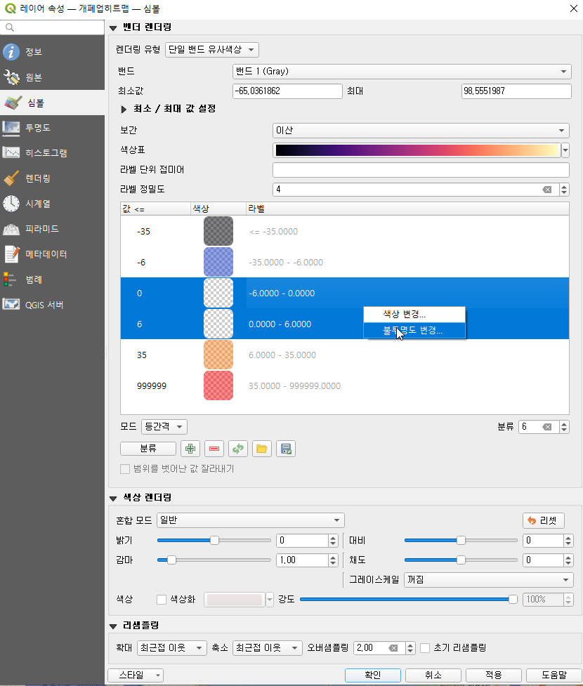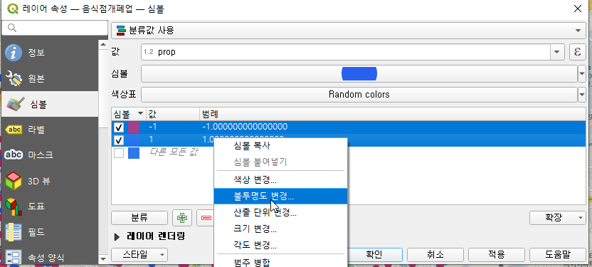 불투명하면 뒤의 지도가 안보이므로 분류 선택 후 오른쪽마우스 버튼 메뉴로 불투명도를 바꿔주자. 70정도면 될 것 같다.