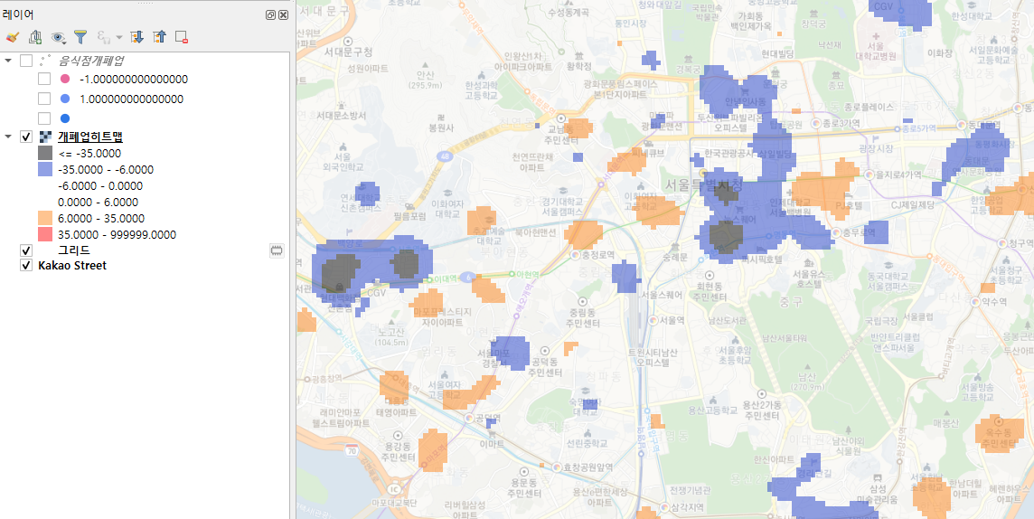 (아, 그러고 보니, qgis의 히트맵 알고리즘이 주변부로 갈수록 옅어지는지, 반경까지 동일한 가중치를 일괄적으로 부여하는지는 잘 모르겠다)