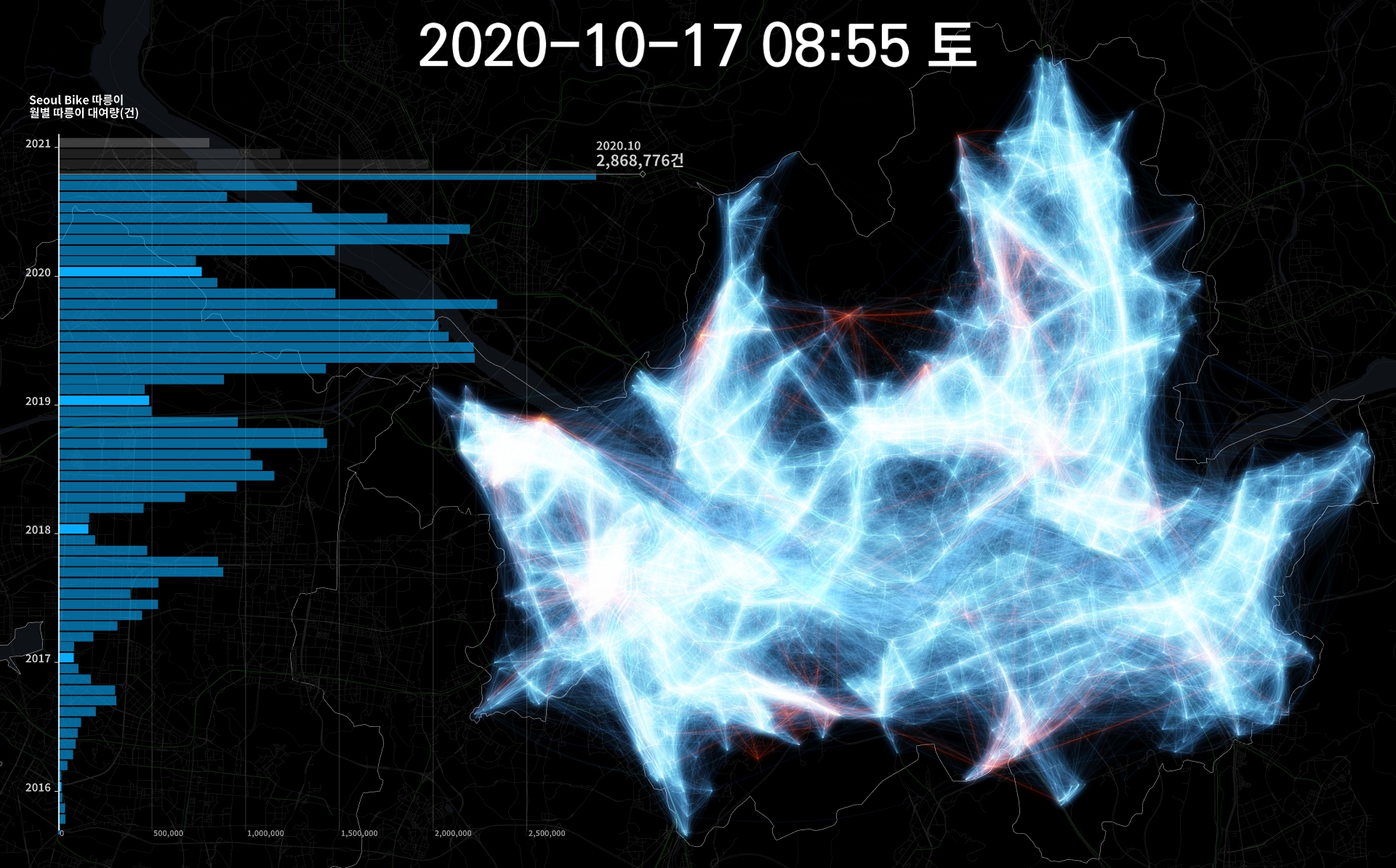 그래서, 대여소가 만들어진 후 한달 간 그 대여소에서 대여하거나 반납한 이용건은 주황색으로 표시해봤다. 4분의 러닝타임 동안에 따릉이 대여소가 서울 전역으로 퍼져나가는 모습을 볼 수 있다. 영상이 4k 이므로 모니터가 크다면, 중간에 멈추고 관찰해보면 대략적인 이용패턴도 확인할 수는 있다. 다만, 그림은 그림일 뿐이라 구체적으로 비교하기는 어렵다.