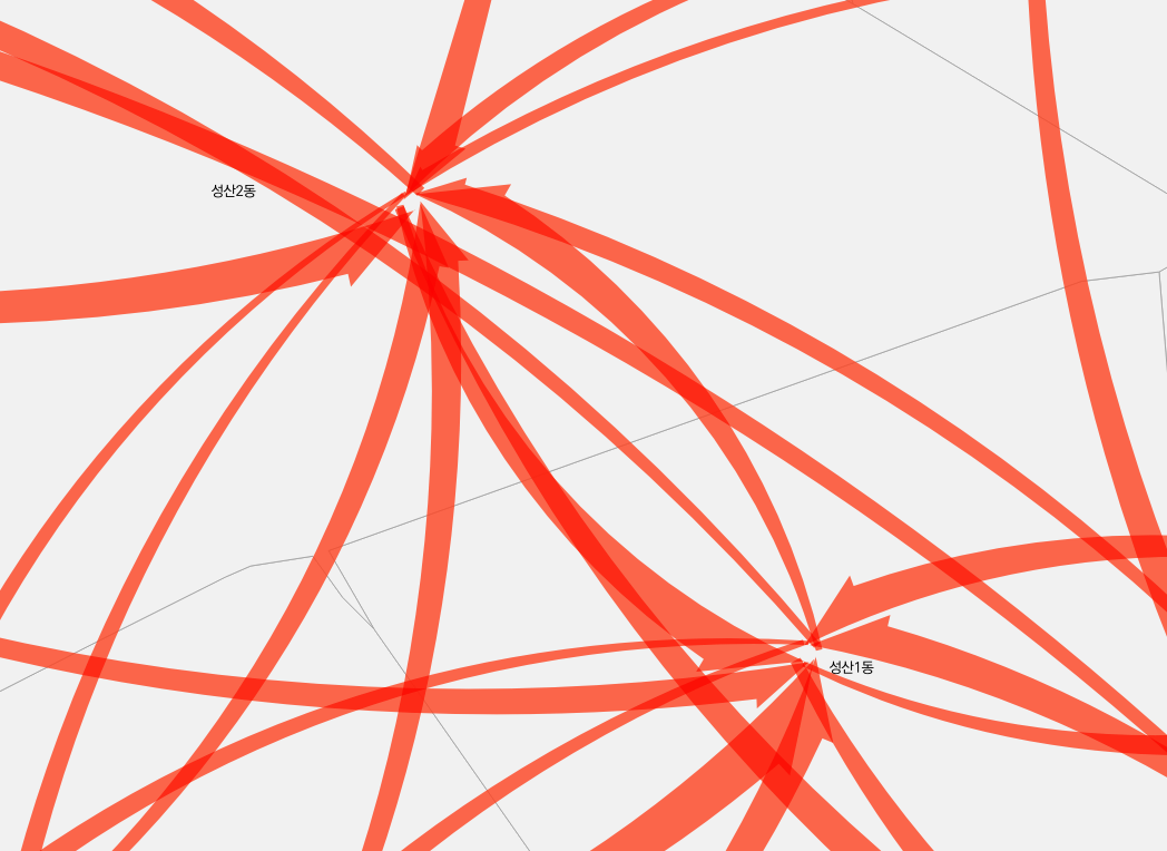 지도 위에 데이터를 표현할 때 아주 까다로운 대상 중 하나는 OD 데이터다. Origin-Destination 데이터는 지도 위의 두 지점을 선으로 이어야 한다. 노드와 링크가 있는 추상공간 위의 네트워크 시각화