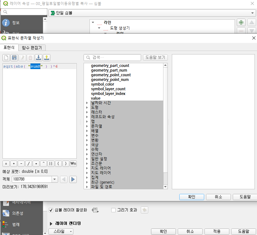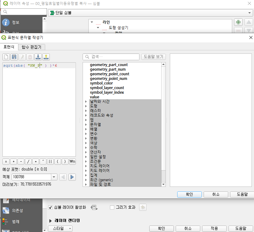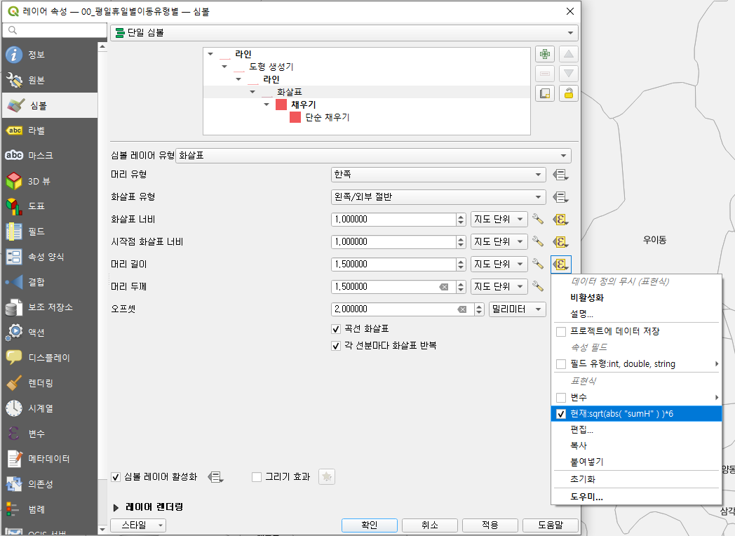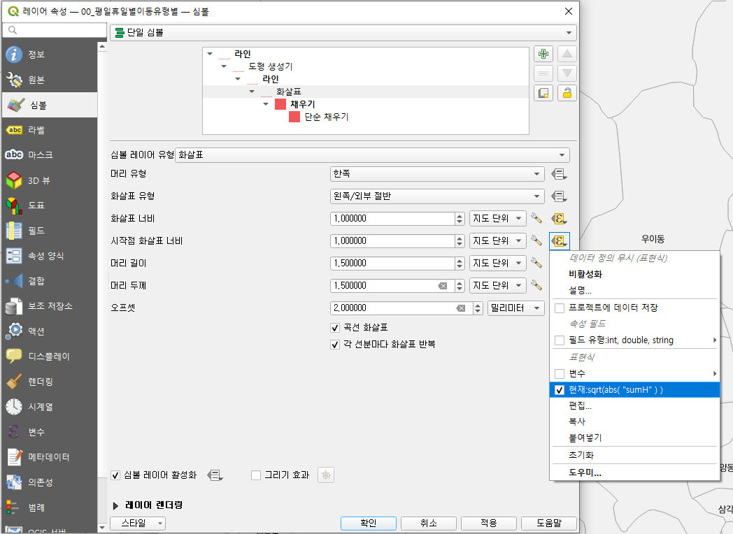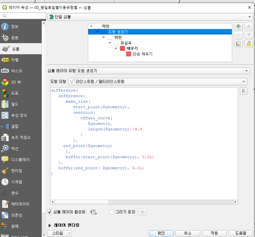 라인을 선택하고 오른쪽에 녹색 + 버튼을 클릭한 후, 심볼레이어 유형에서 '도형생성기'를 선택한다.