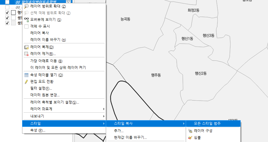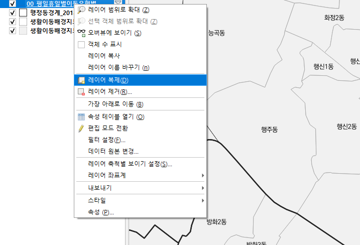 시군구 경계와 시도 경계는 면은 투명하게 두고 선만 칠하면 된다. 당연히 두 개 모두 생활이동배경지도.shp 보다 레이어상 위에 위치해야 한다.