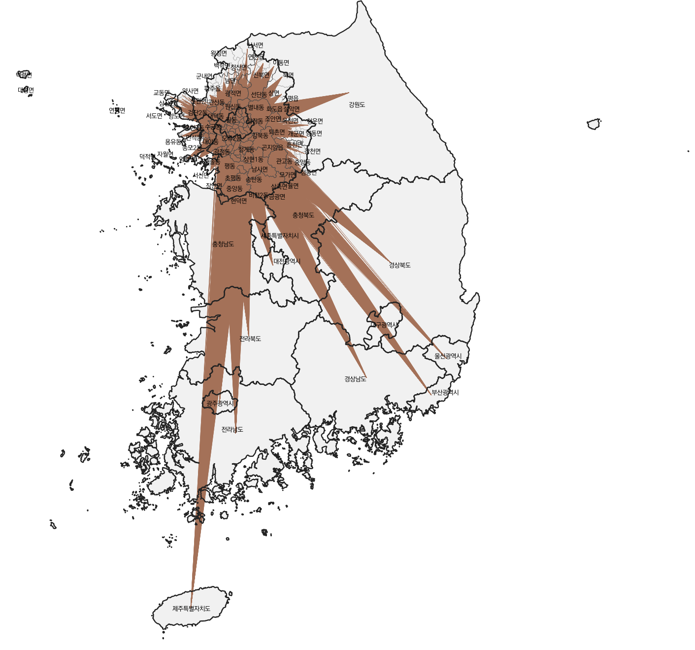 앞의 글에서 여러가지 사례를 들어 OD 시각화에서 고민했던 점들을 썼다면, 이번에는 전국 인구 순이동 시각화를 조작해보면서 설명해보겠다. 앞의 글이란 이것 OD 시각화 1 : 여러가지 시도 지도