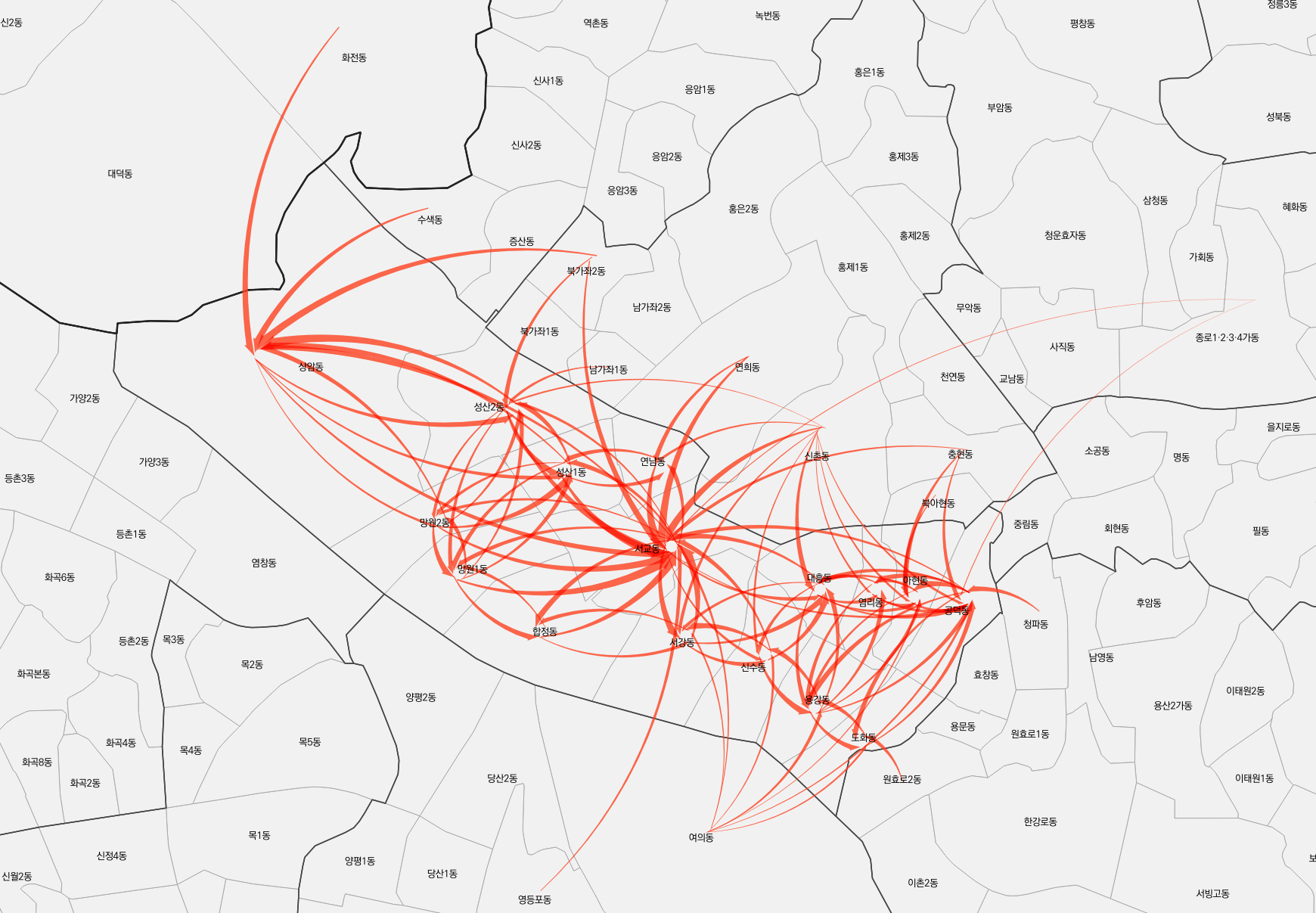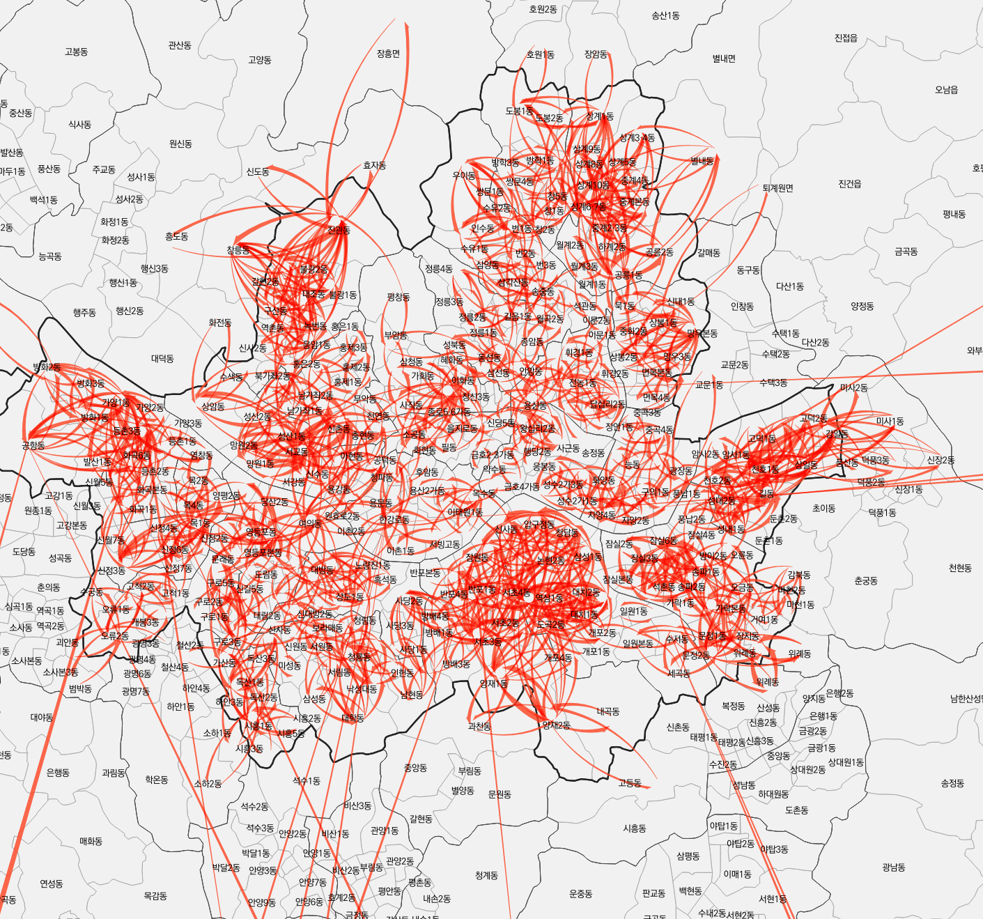 지도 위에 데이터를 표현할 때 아주 까다로운 대상 중 하나는 OD 데이터다. Origin-Destination 데이터는 지도 위의 두 지점을 선으로 이어야 한다. 노드와 링크가 있는 추상공간 위의 네트워크 시각화