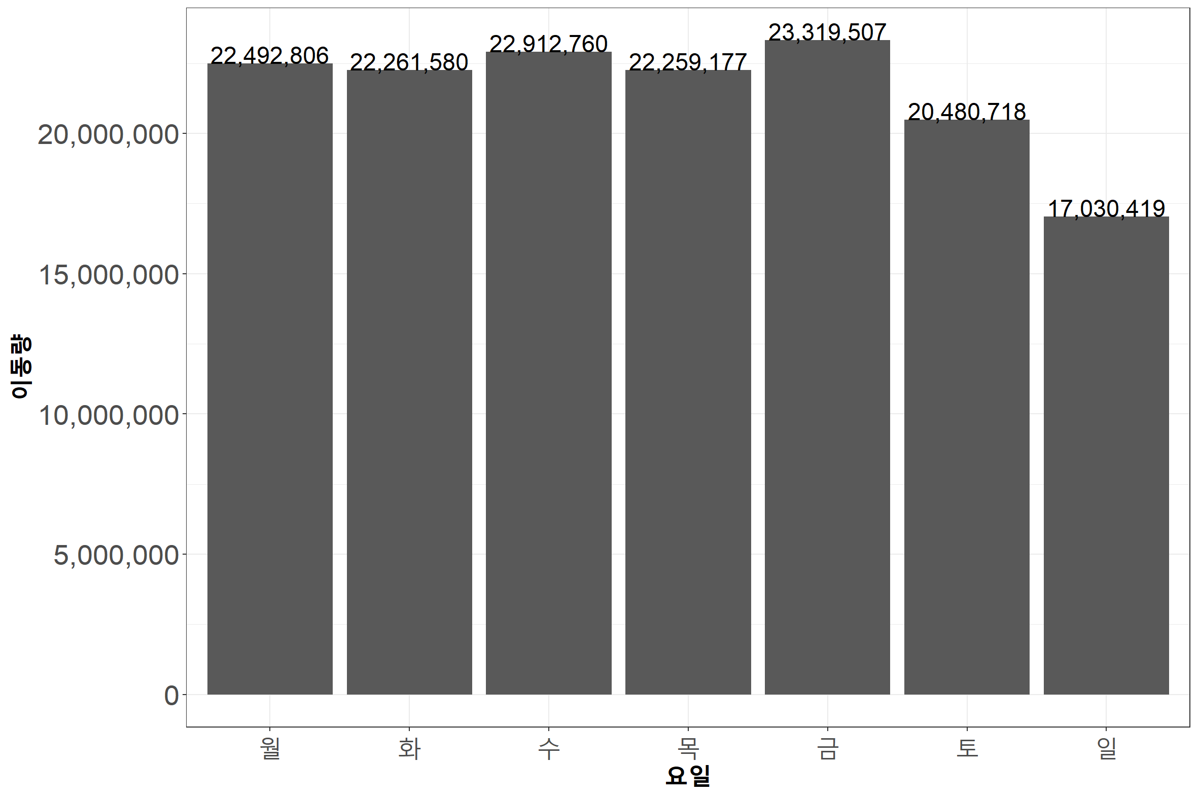 데이터를 검증할 겸, 먼저 요일별로 이동량을 집계해보자.