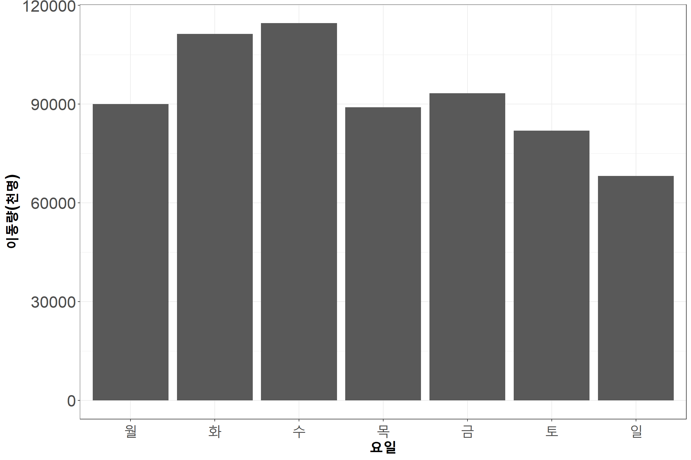 아하. 요일별로 그대로 집계했을테니 데이터가 위처럼 차이난 것이다. 그렇다면 요일의 수를 세어서 나누어 주어야 요일별 이동량을 제대로 비교해 볼 수 있겠다.