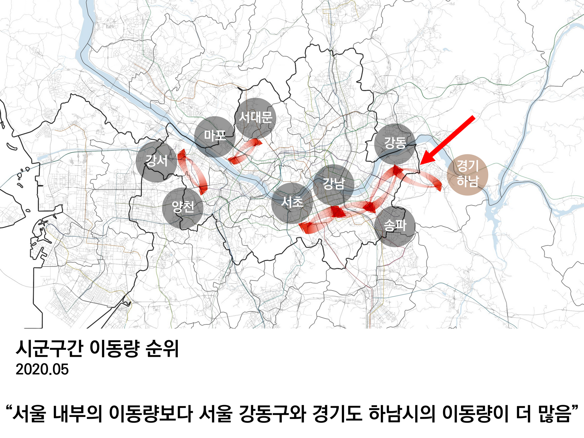 그런데 6위는 엉뚱하게도 강동구와 경기도 하남시다. 하남시는 경기도임에도 불구하고 서울 내부의 다른 지역들과 함께 비교해도 이동량이 6위에 이른다.