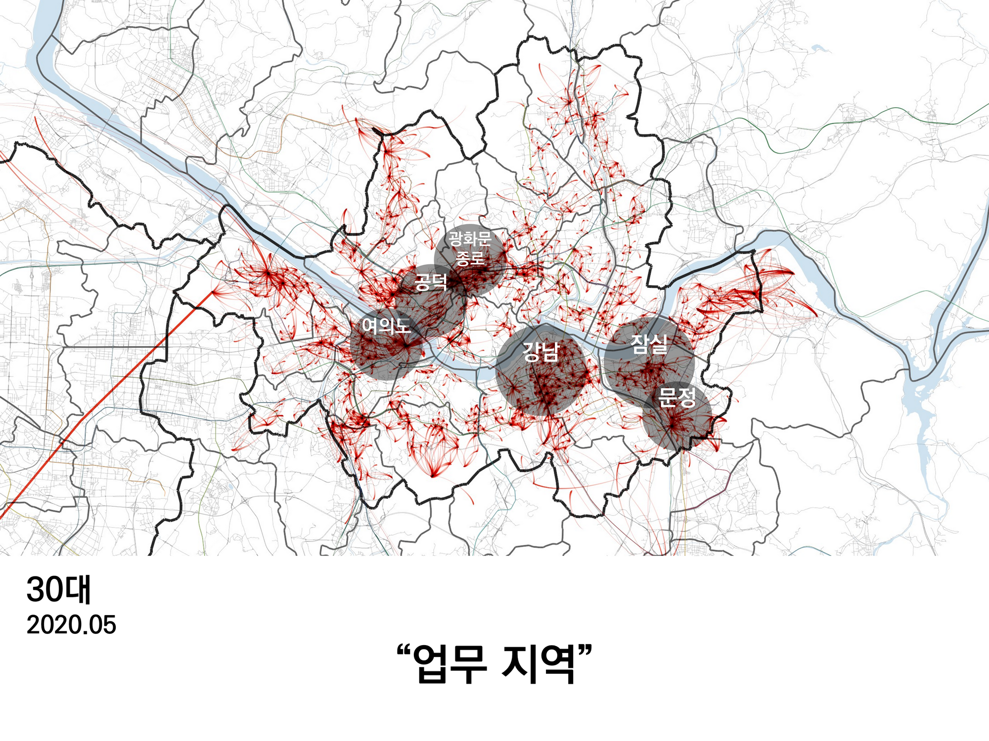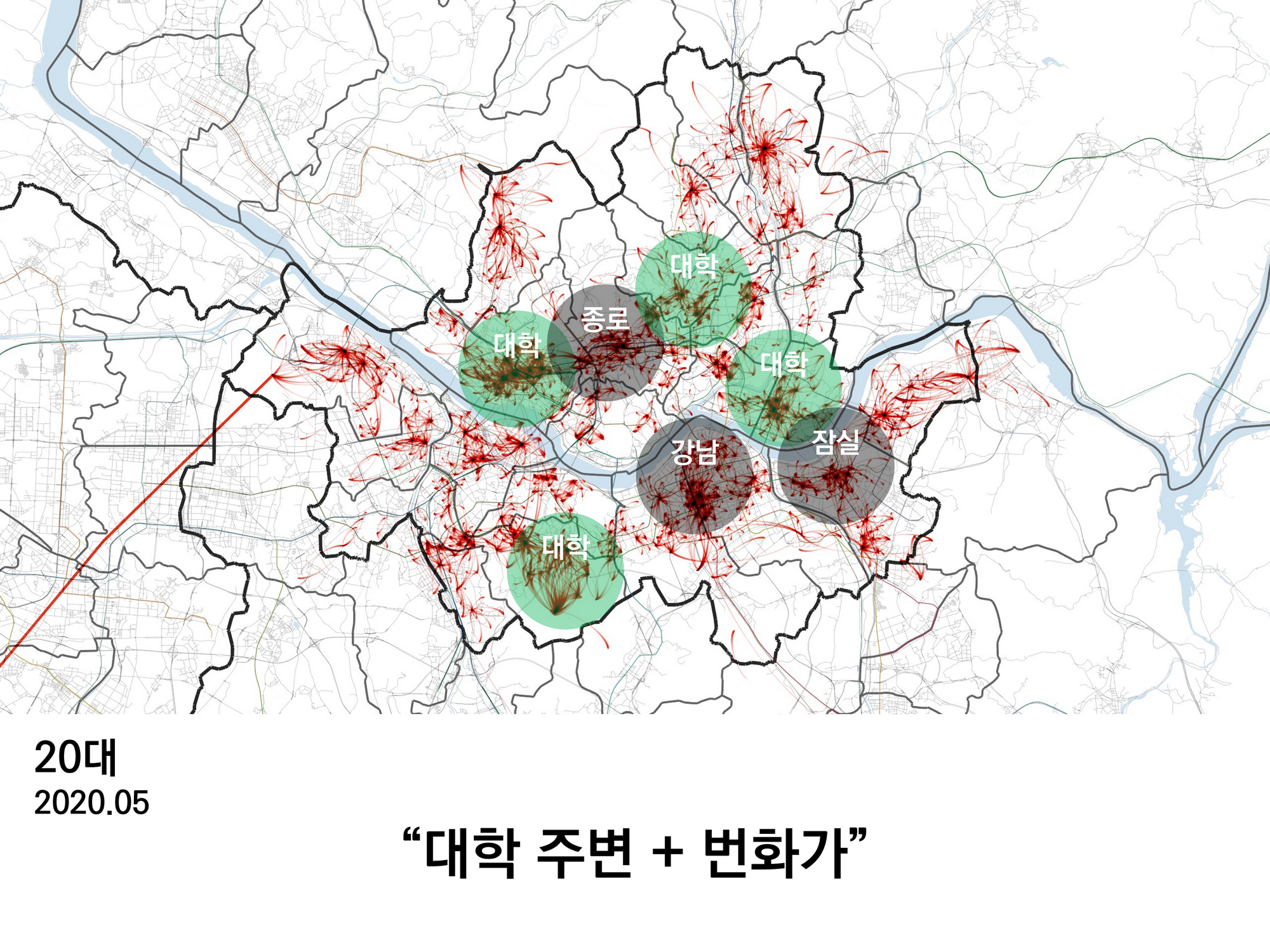 20대의 이동은 대학 주변과 종로, 강남, 잠실 등 주요 번화가에 집중되어 있다.