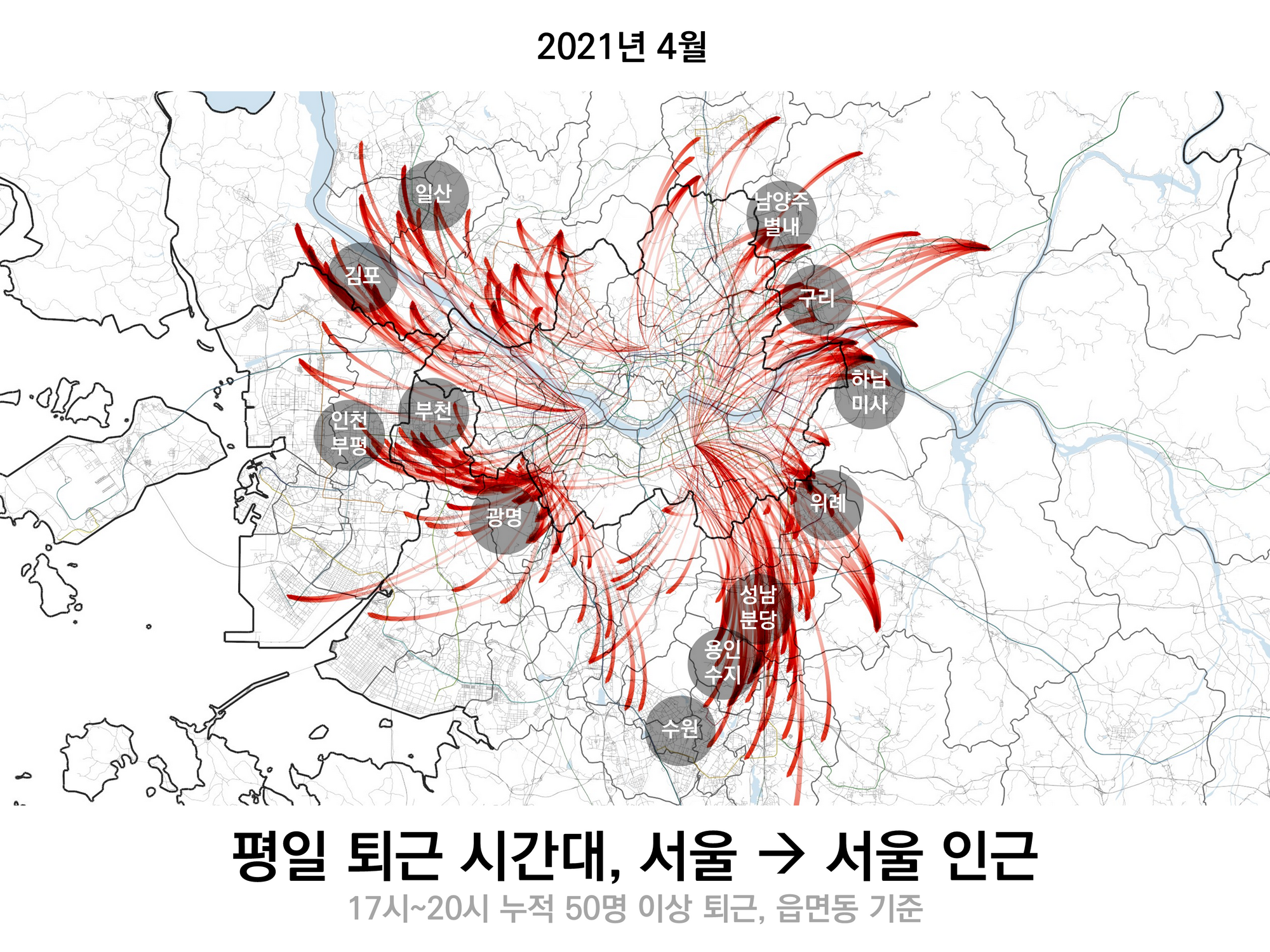 서울 내부의 이동이 워낙 많으므로 진하게 겹쳐져 나타났고, 멀리 제주도, 부산, 강릉에도 오고가는 사람들이 많다. 제주도와 오가는 이동은 서울 시민인 경우도 있고, 제주도민일 수도 있으며, 인천 사람이 김포공항에 가서 제주도로 이동했다면, 그 이동 또한 포함된다.