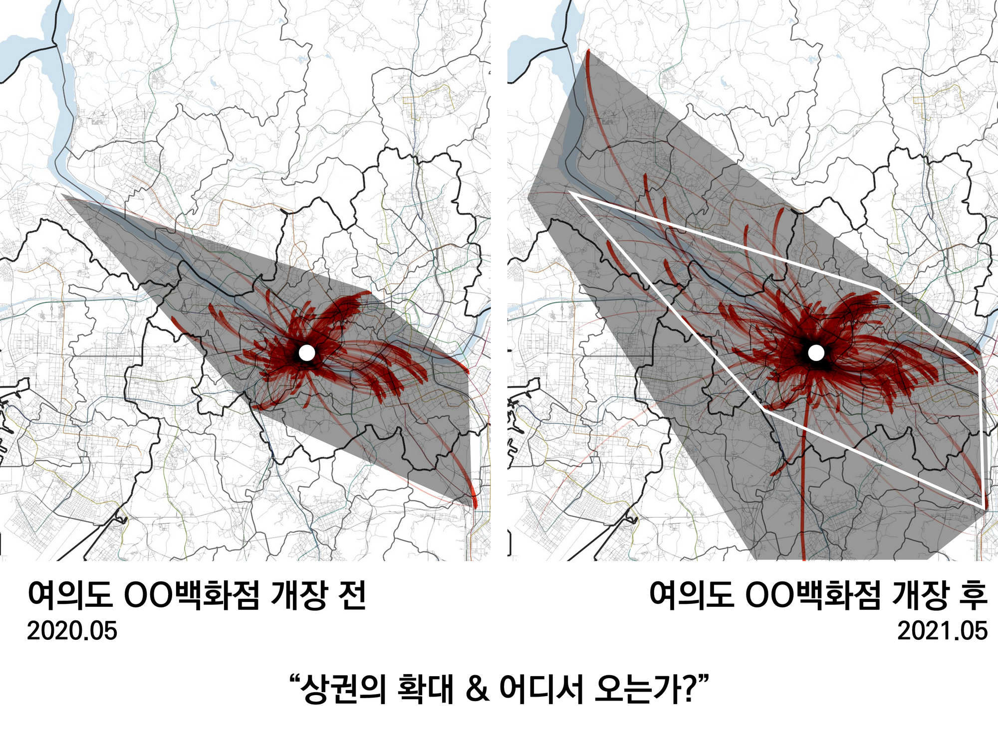 이 백화점은 2021년 2월 말경에 개장했는데, 2월과 3월을 비교하자니 계절적 요인에 따른 변화도 있을 것 같아서, 개장 효과가 다소 사라진 2021년 5월과 1년전 5월을 비교했다. 확실히 사람들이 오고가는 권역도 넓어지고 강남쪽으로 연결된 선들도 많고 굵어졌다.