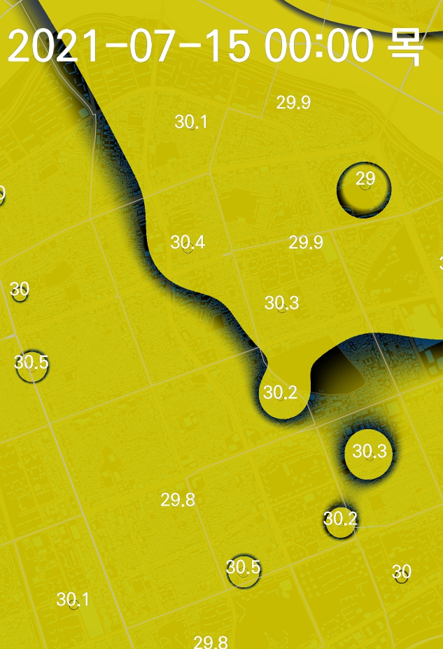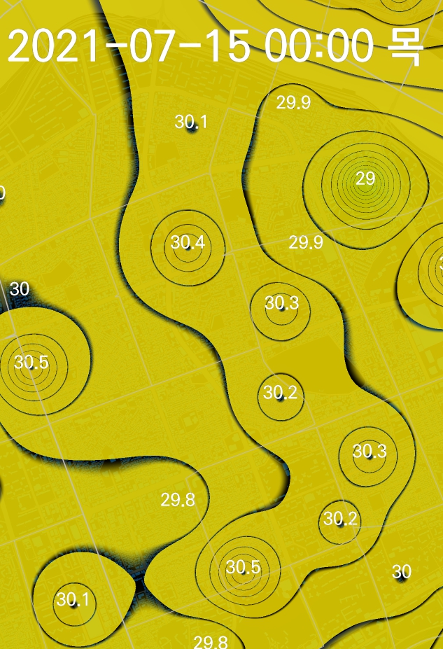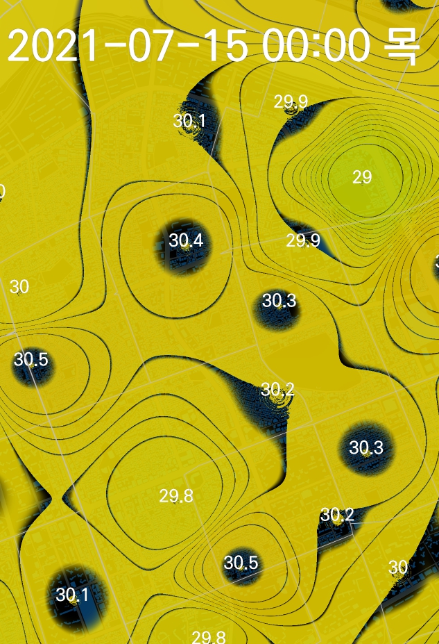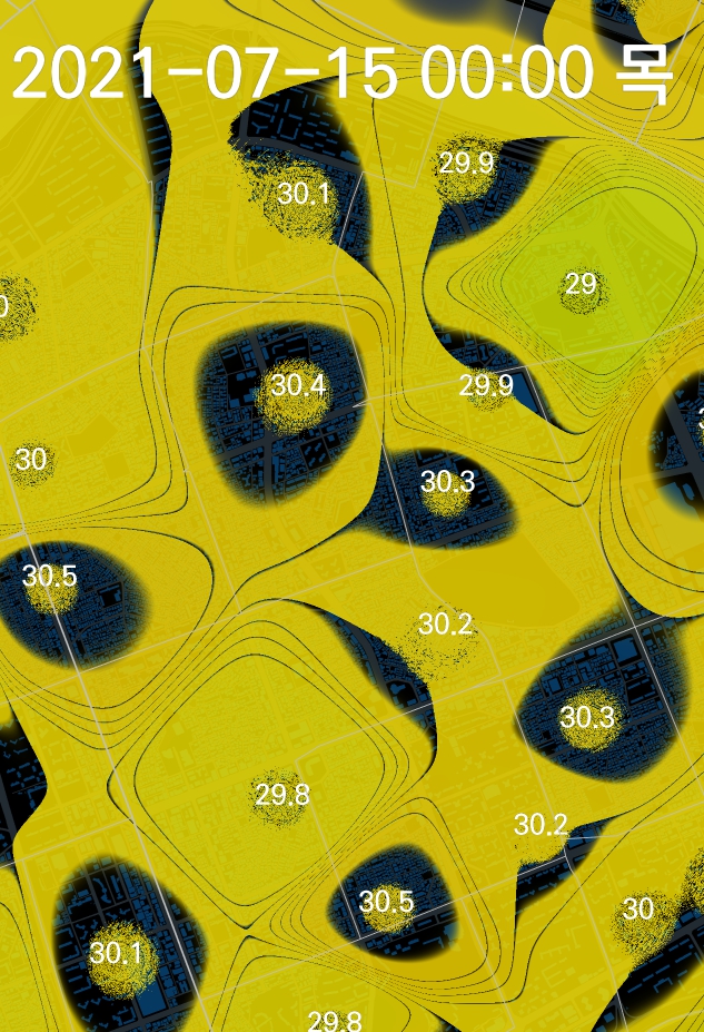 *. 가끔씩 화면에 온도가 많이 높은 빨간색 부분들이 등장하는 것은 결측값 보간을 잘못 해서 그렇다.(7월 16일 18:59 같은 부분). 다 만들고 나서 깨달았으므로 코드는 수정했지만 결과물은 그냥 그대로 두었다.