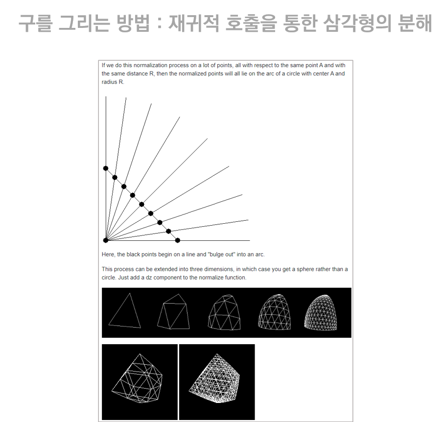 사실 구를 그리는건 웬만한 프로그램들에서 클릭 한두번으로 가능하다. 다만 맨바탕에 그리려다보면, 삼각형만으로 구를 만들어내야 한다. 이미 알려진 알고리즘이 많지만, 어떻게 그리는게 여러가지 대응에 효율적일지 고민을 하게 된다. 다행히 이런 기본적인 내용들은 대부분 세상의 똑똑하면서 친절하기까지 한 사람들이 이미 자세히 설명을 해놓았다. 찾기만 잘 찾으면 된다.