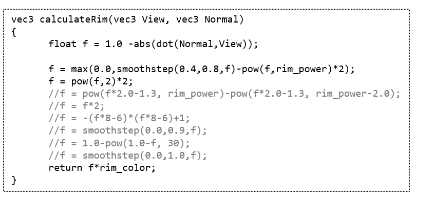 아래와 같이 뷰벡터와 정점 노말벡터를 계산해서 rim 값을 계산하는 함수로 보낸다.