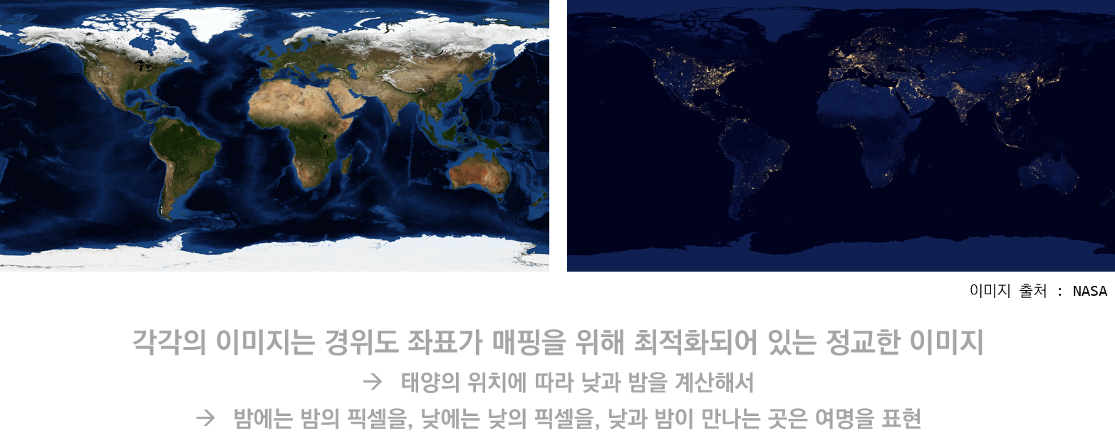 마지막 단계라고 설명한 부분은, 사실 두번째 세번째 단계에 이미 포함되어 있다. 낮과 밤의 이미지를 맵핑할 때 태양의 위치에 따라서 두 이미지의 픽셀값을 취사선택해야 하기 때문에 이미 수식에 해당 변수들이 포함되어 있어야 한다.