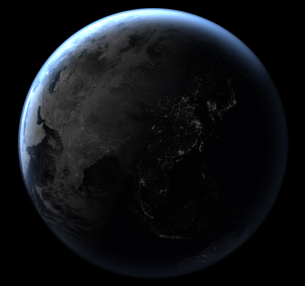 아무것도 없는 공간에 구를 그리고 지구의 이미지를 덮어씌워보자. 낮과 밤을 촬영한 NASA 이미지 두 장을 태양이 비추는 곳과 그렇지 않은 곳에 적절히 맵핑해주자. 그리고 두 부분이 만나는 곳을 황혼처럼 약간 붉게 만들어보자. 푸르스름한 지구 주변의 대기도 표현하면 그럭저럭 완성이 된다.