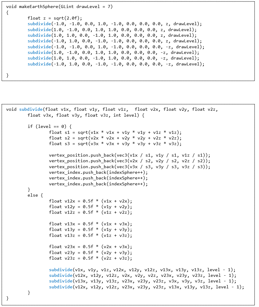 재귀적 호출을 통해 마지막 레벨인 if (level==0) 구간에 도달하게 되면, 각 정점의 좌표를 normalize 하는 과정을 거쳐 배열에 입력된다. 이 정점은 glDrawArrays를 통해 그대로 셰이더로 보내고, 지구의 반지름은 셰이더에서 곱해주게 된다.