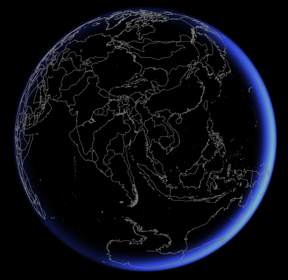 위의 이미지가 낮과 밤 이미지 없이 가장자리 부분만 표현한 이미지다. (선으로 된 지도가 지구 반대편과 겹쳐서 약간 복잡하게 보인다.)
